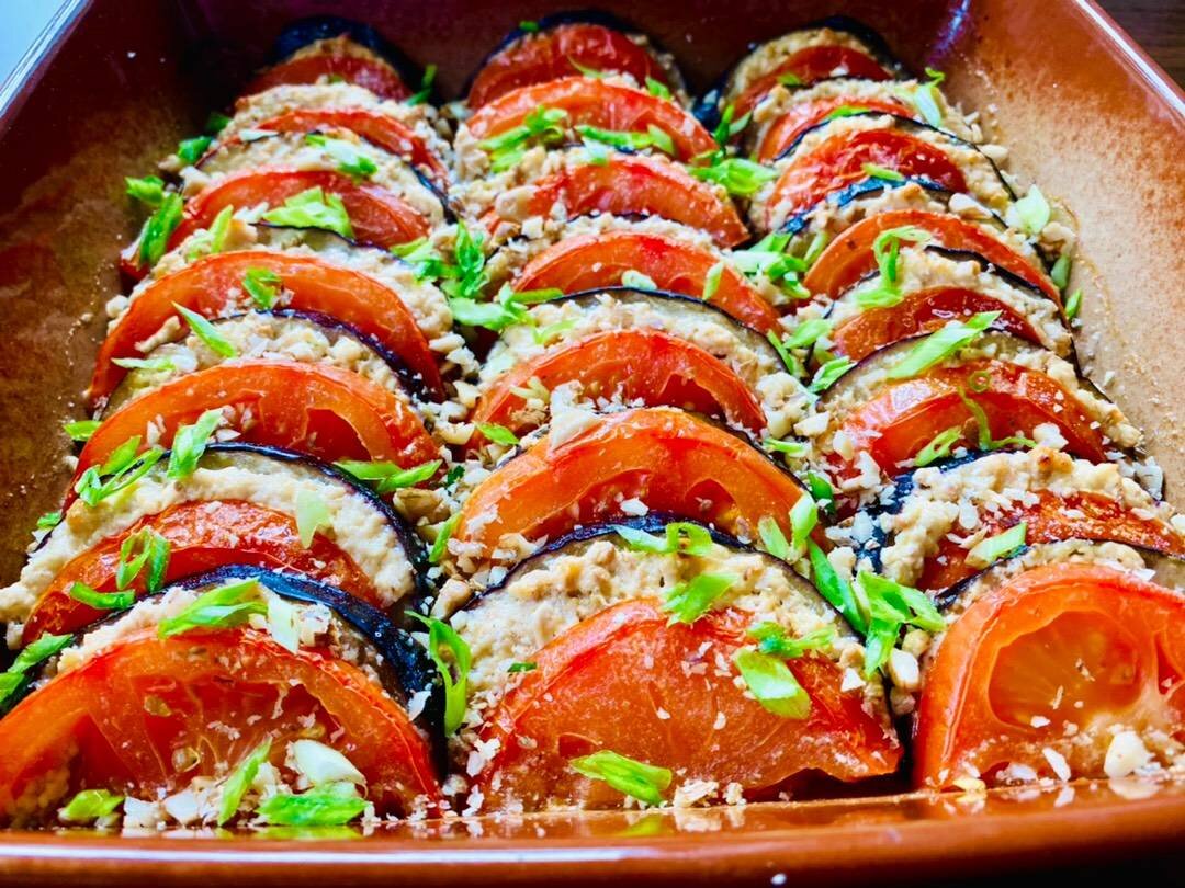 Подготовить керамическую форму. На каждую пластинку баклажана намазывать сырную пасту и накрывать пластинкой помидора. Укладывать в форму для запекания ровными рядами, немного внахлест.