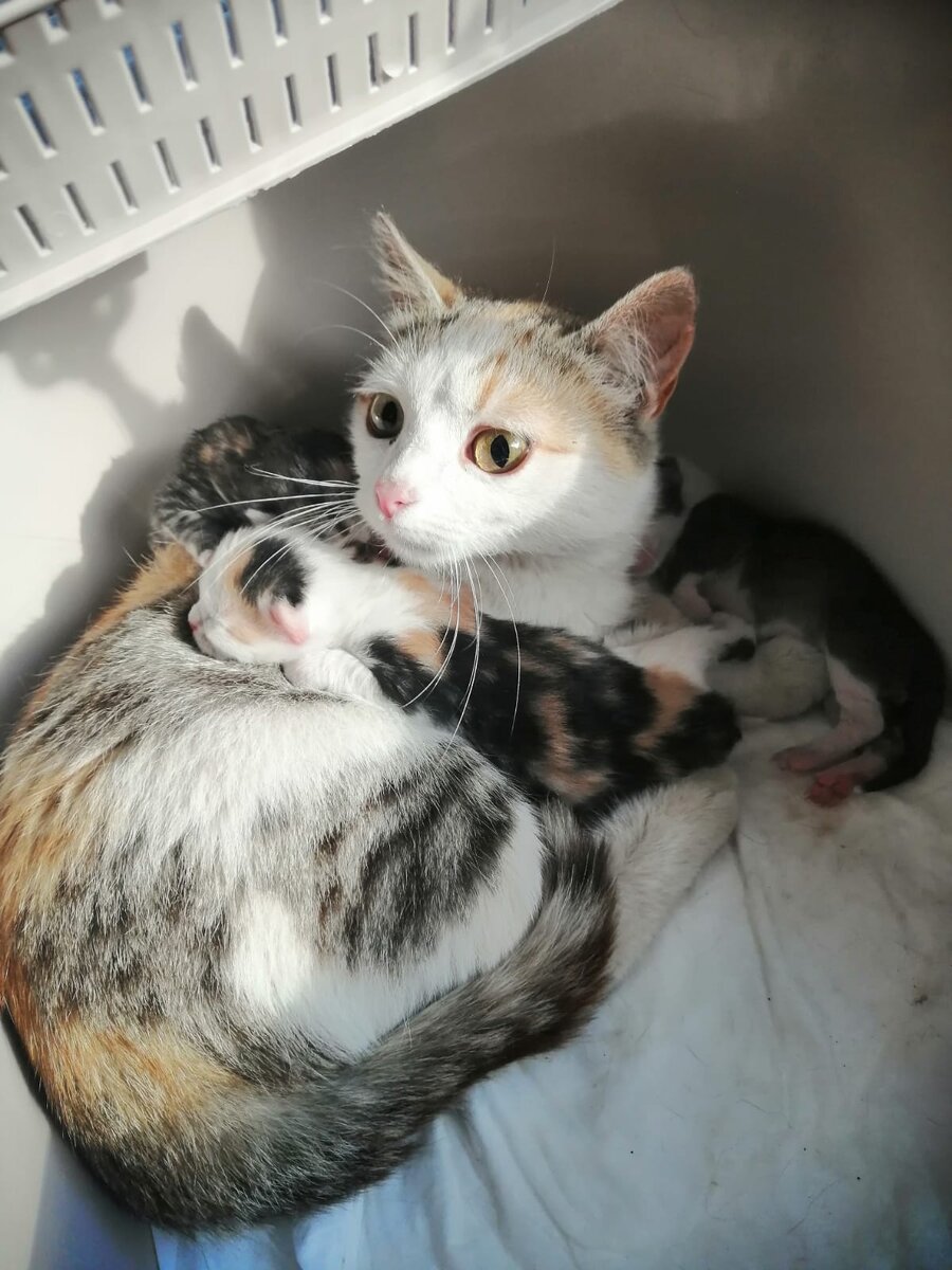 Друзья! На днях забрали вот такую семейку. Мамочке самой месяцев 8 + 4 крохотных котеночка.