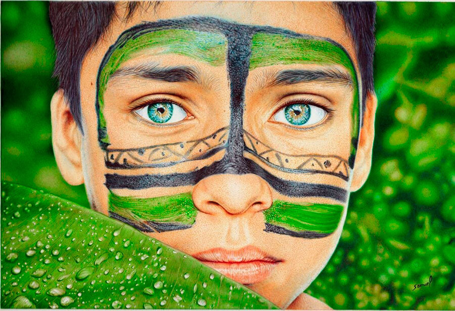 Сэмюэль Сильва художник гиперреалист, точнее художник фотореалист, создает свои работы при помощи обычных шариковых ручек, и еще раз подтверждает, что для настоящего художника не столь важно, чем рисовать. Настоящий художник может создать произведение искусства из любых подручных материалов. На создание одной такой работы Сэмюэль Сильва тратит от 5 до 50 часов кропотливой работы. О процессе создания своих работ Самуэль Сильва рассказывает: «После нанесения на поверхность, чернила шариковой ручки быстро сохнут и их уже не стереть. И тогда, для получения нужного эффекта, можно просто наносить различные цвета. Чтобы расширить свою палитру, и я накладываю разноцветную штриховку слоями, получая иллюзию множества оттенков». Сэмюэль Сильва говорит, что: «На данный момент моей жизни я довольно хорошо знаком с мелом, карандашом, цветным карандашом, пастелью, маслом и акрилом», но предпочитает создавать свои рисунки при помои шариковых ручек. Сэмюэль Сильва родился в Португалии в 1983 году. Любо