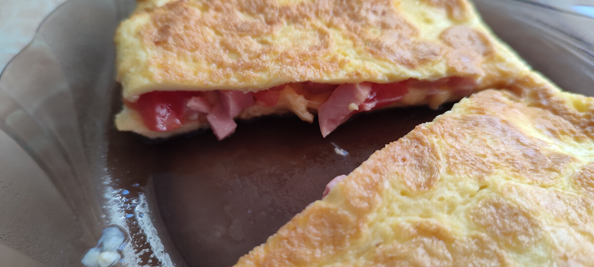 Приветствую вас! Давайте приготовим один из самых любимых завтраков моего сына. Это нежный, воздушный омлет с начинкой. Вкус просто обалденный. Начнем. Для приготовления нам понадобиться: 2 яйца, помидор, 2 сосиски, 100гр любимого сыра, 1 ст.л. майонеза, щепотка соли, черный молотый перец по вкусу. Нарезаем сосиски и помидор мелко, сыр натираем на терке Яйца взбиваем и добавляем 1 ст.л. майонеза, соль и черный молотый перец по вкусу На раскаленную сковороду наливаем 1ч.л. растительного масла и 1ч.л. сливочного масла. Когда масло растает, равномерно смазываем сковороду силиконовой кисточкой. Выливаем яйца, жарим омлет 2 минуту под крышкой на самом слабом огне. Потом переворачиваем "блинчик" и выкладываем начинку на один край. Аккуратно поддеваем лопаткой второй край, накрываем начинку так, чтобы получился конвертик. Жарим под крышкой конвертик 1 минуту с одной стороны и 1 минуту с другой. Подавать можно со сметаной, зеленью, кетчупом и так далее на ваш вкус. Получается очень сочно и вк