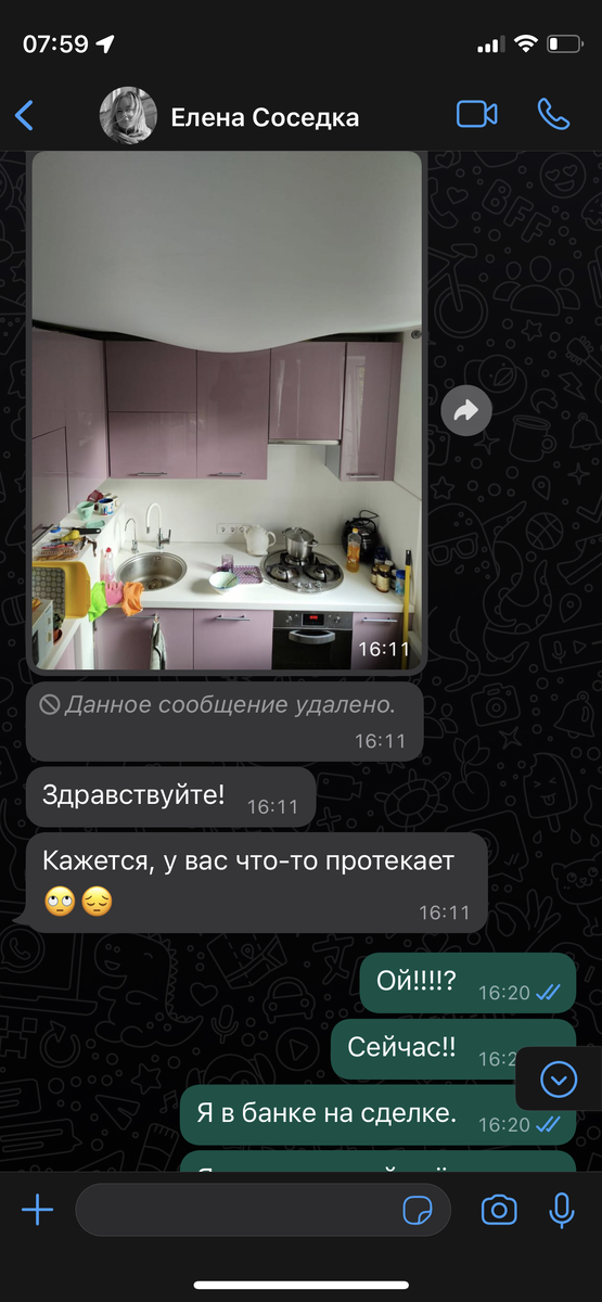 Сижу я вчера на сделке и предвкушаю это невероятное чувство закрытого гештальта. И тут, мне приходит вот такое сообщение. Я позвонил соседке Елене. Выяснилось, что оно конечно натекло, но катастрофы никакой нет и в общем-то, у меня есть время завершить начатое и приехать домой, чтобы перекрыть воду и заниматься дальнейшими процедурами по устранению случившегося пиздеца. Сделка была по первичке и по-сути, моё присутствие там особо не требуется. Моя работа, как агента, полностью выполнена. Остаётся лишь подписать документы и внести деньги. Любопытный спектр эмоций испытываешь, когда завершилась сделка, дома пиздец, а тебе ещё нужно при этом при всём поработать и решить что-то с соседским потолком. Крайне разумным решением было поехать на метро, благо ветка одна и та же Я пришёл в офис, забрал ключи от дома и прыгнув на крайне удачно попавшийся рядом самокат, помчал домой. Оказалось это был кран в ванной я даже могу предположить почему он тёк. Помните, я недавно на скорой катался