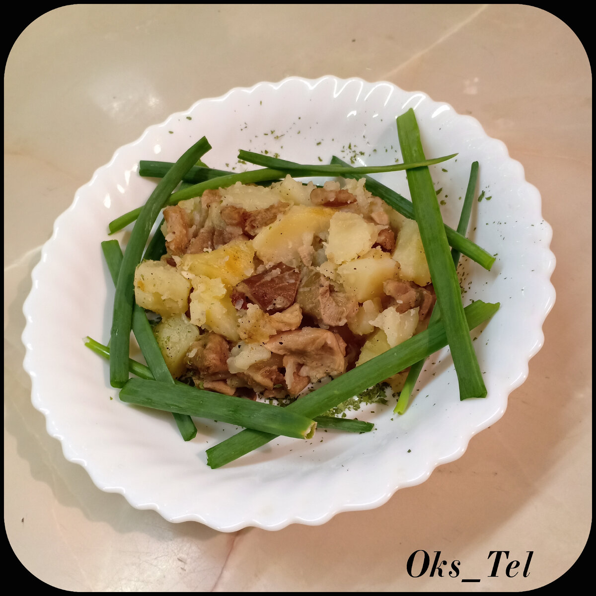 ПОНАДОБИТСЯ: - 400г отварных вешенок, - 1 головка репчатого лука, - 2 зубчика чеснока, - 900г картофеля, - 100мл грибного бульона, - соль и перец - по вкусу, - 30г сливочного масла, - масло подсолнечное для жарки. ПРИГОТОВЛЕНИЕ: 1. Грибы почистить от мусора, хорошо промыть, отварить в подсоленной воде, откинуть на дуршлаг. 2. Почистить и помыть картофель, нарезать крупными кубиками. 3. Лук и чеснок почистить и мелко покрошить. Грибы нарезать произвольными кусочками. 4. В казане или кастрюле с толстым дном обжарить на растительном масле грибы, лук и чеснок до золотистого цвета, в конце жарки поперчить по вкусу. 5. Влить бульон, добавить картофель, посолить по вкусу, все хорошо перемешать, прикрыть крышкой и поставить в духовку на 20мин при t 200C, время от времени помешивая, чтобы картофель равномерно запекался. Через 15мин крышку снять, поставить в духовку еще на 20мин при t 220C. За это время излишки бульона должны выпариться. 6. Затем в картофель добавить сливочное масло, аккуратн