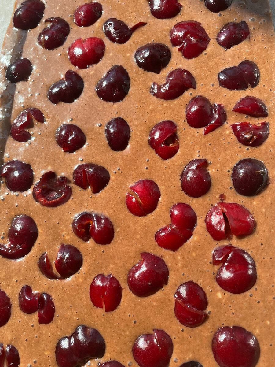 Вот и настали выходные. Самое время порадовать себя и своих близких вкуснющим пирогом. Как всегда, делать быстро. Используем самые обычные ингредиенты. Результат потрясающий. Выпекать такой пирог нужно в духовке, температура 180 градусов. Время 40 минут. У меня включён равномерный прогрев верха и низа, противень стоит на среднем уровне. Для приготовления этого красавчика нам потребуется 2 яйца, 1 стакан сахара, 3 ложки сметаны, 1 стакан муки, разрыхлитель, 2 ст л какао. (стакан обычный 200 мл) Вообще классический рецепт идёт без какао, но я подумала, что сочетание с черешней…надо делать с какао. Сочетание бомба. Всё очень хорошо перемешали. И выливаем в форму. Выпекаем. В идеале, дать поостыть, но я не удержалась и слопала сразу 2 куска, хотя не сильный любитель пирогов. Так просто и вкусно… попробуйте.