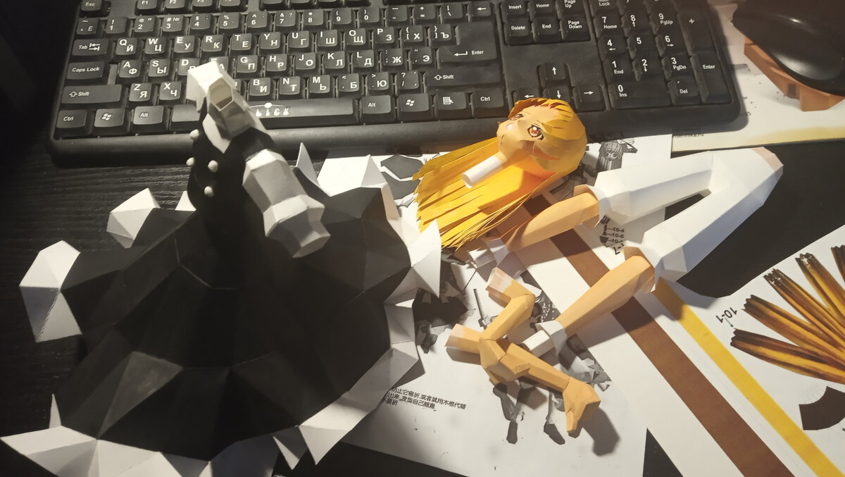 Как обычно, выкройки распечатаны на ватмане формата А4, всё полностью покрашено акриловыми красками. Собралось без проблем. Собирать следует так - сначала полностью делаем верх с юбкой. Затем ноги, отдельно боты. Пробуем вставить ноги в боты и поймать центр тяжести, чтобы стояли. Примериваем верх. Убеждаемся, что всё стоит само, без метлы. Густо мажем клеем щиколотки и вставляем в боты. Ставим верх, ловам центровку. Ждём пока боты присохнут. Затем соединяем верх с ногами и в финале приклеиваем метлу. У меня кукла стояла на ногах и без неё. Метла получилась как опора в режиме страховки. Ниже несколько фоток и только одна по процессу сборки. Кот уже был сделан раньше. Совсем внизу поста ссылка для скачивания. Ссылка для скачивания: