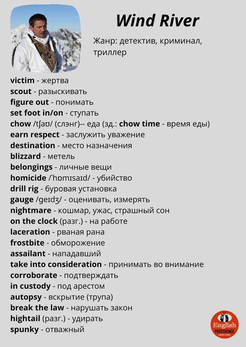 Прилагаю список слов к фильму. victim - жертва scout - разыскивать figure out - понимать set foot in/on - ступать chow /tʃaʊ/ (слэнг) - еда (зд.: chow time - время еды) earn respect - заслужить уважение destination - место назначения blizzard - метель belongings - личные вещи homicide /ˈhɒmɪsaɪd/ - убийство drill rig - буровая установка gauge /ɡeɪdʒ/ - оценивать, измерять nightmare - кошмар, ужас, страшный сон on the clock (разг.) - на работе laceration - рваная рана frostbite - обморожение assailant - нападавший take into consideration - принимать во внимание corroborate - подтверждать in custody - под арестом autopsy - вскрытие (трупа) break the law - нарушать закон hightail (разг.) - удирать spunky - отважный #en