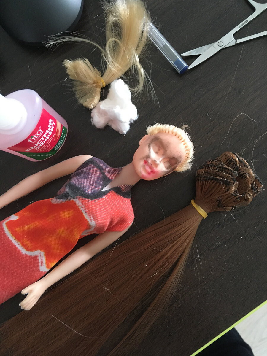 И вот я решилась на переделку второй куклы Барби. Первый опыт был удачным, поэтому я отправилась в «Галамарт» за куклой и в «Сима-ленд» за волосами для неё. Кукла - вуду, потому что решила сделать ее похожей на меня. Так как я не замужем, надо одеть ее в свадебное платье 😅 Итак, все как и в первый раз: избавляемся от старых волос и макияжа Затем я делю трессы на маленькие пряди и вставляю в голову куклы с помощью иглы Считаю платье самым интересным в создании этой куклы. Оно из атласной ленты, мягкого подкладочного трикотажа, декорировано бисером и маленькими розочками из атласной ленточки. Наряд получился шикарный. Макияж выполнен сухой пастелью, акварельными карандашами и тенями для век. Закрепила традиционно лаком для волос 😅 Прикрепляю фото до и после, чтобы Вы ощутили разницу И селфи с куклой. Как считаете, похожи?