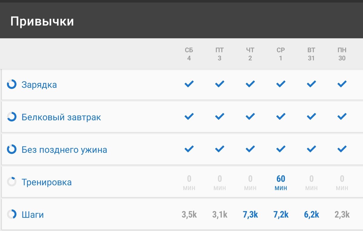 Всем привет! Меня зовут Юлия. Я похудела на 19 кг и продолжаю свой путь к стройности и здоровью. Мне помогает забота о себе и ваша поддержка. Я взвешиваюсь раз в неделю и измеряю свои объемы. Здесь я каждую неделю пишу отчет за неделю – что делала, что ела и какой получился результат. Такие отчеты помогают следить за ситуацией, видеть динамику и отслеживать как различные события в жизни влияют на пищевое поведение. Вы можете прочитать предыдущие отчет, если вам интересно. Измерения в начале недели 30.05.22: Вес – 60,6 кг ОТ (объем талии) – 68 см ОЖ (объем живота) – 84 см ОБ (объем бедер) – 99 см Конечно, мне уже очень хочется увидеть на весах цифру 59 и отметить свой результат в 20 кг. Но не будем торопить события. В понедельник я заболела. За питанием начала следить только со среды. Мои дневники на этой неделе: В субботу какая-то суета была весь день перед отъездом, дневника нет. Результаты недели по привычкам: Итого за 6 дней – 29,6 тысяч шагов. Проверяем выполнение плана: ✔белковы