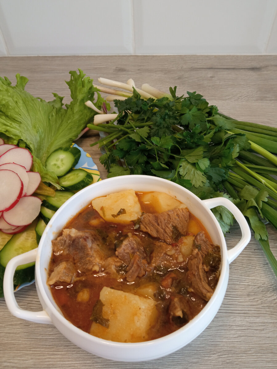 Самое универсальное, сытное и быстрое в приготовлении блюдо. В весенне-летний сезон, благодаря многообразию свежей зелени и овощей, оно приобретает особый аромат и изысканный вкус. Начнём приготовление. Мясо хорошо помоем и нарежем порционными кусочками. Я брала антрекот из говядины. Косточки я оставила для приготовления бульона. На разогретую сковороду с маслом выкладываем мясо и обжариваем. Солить пока не нужно, чтобы не вытекал из него сок. Сверху сковороду желательно накрыть жироулавливателем (крышка от брызг), а не крышкой. Когда на мясе образуется румяная корочка, переворачиваем его на другую сторону и тоже хорошо обжариваем. Займёмся пока приготовлением овощей. Лук, морковь, корень пастернака (по желанию), болгарский перец очищаем и нарезаем кубиками. Мясо обжарилось до румяной корочки. Немного его присолим, перемешаем и через минутку переложим в достаточно большую кастрюлю. Сковороду аккуратно (чтобы не обжечь руки) протираем бумажным полотенцем и налив