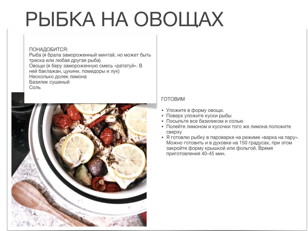 Рыба на овощах рыба🍤 Что понадобится? ▫️Рыба (замороженный минтай, треска или другая) ▫️Овощи (советуем смесь «рататуй». В ней баклажан, цукини, помидоры и лук) ▫️Несколько долек лимона ▫️Сушеный базилик ▫️Соль Приступаем: Вкусно и полезно💛 Приятного аппетита! Больше рецептов в нашей группе вконтакте https://vk.com/slgymru