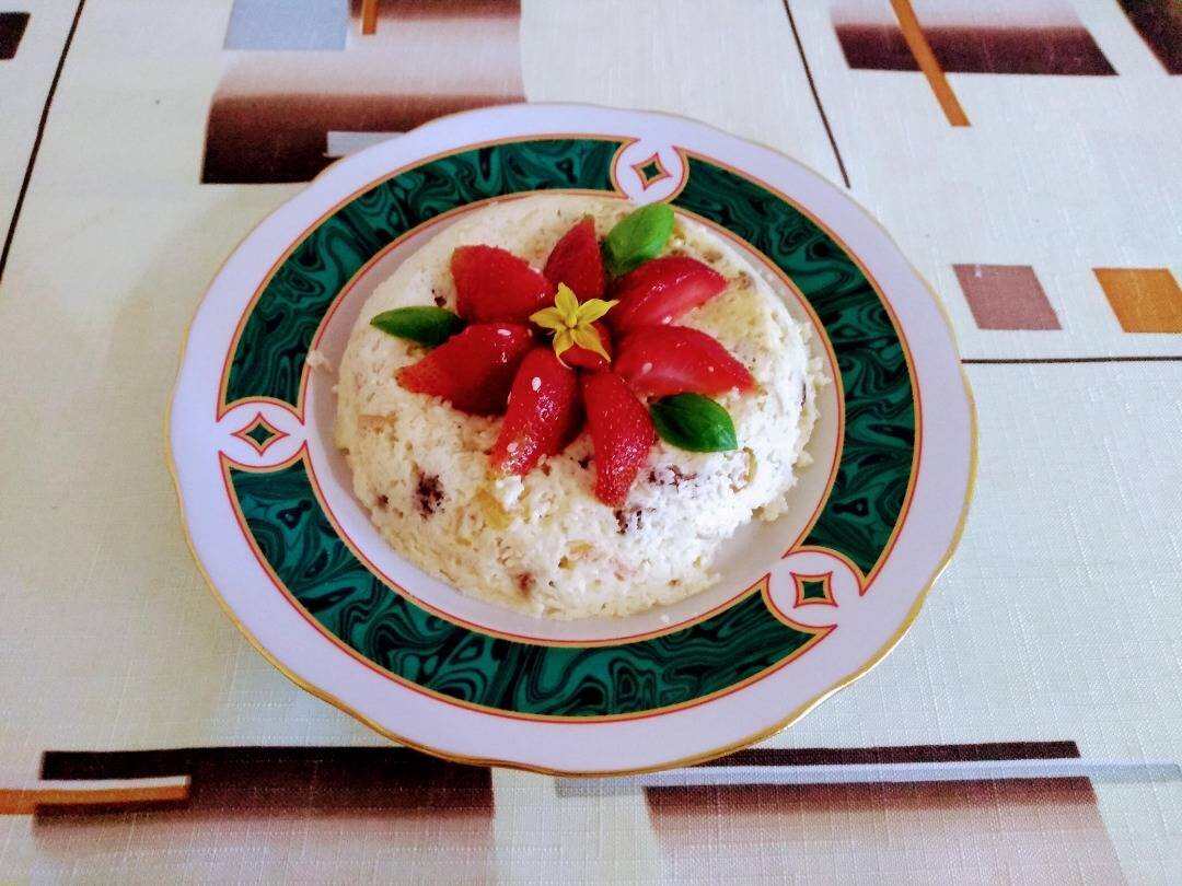 Творожная запеканка с изюмом и курагой в микроволновке
