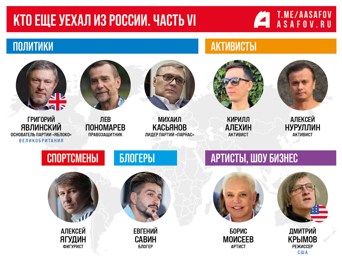 Продолжаем следить за новой волной эмиграции. За последние две недели список тех, кто покинул Россию, пополнили 9 фамилий – это политики, активисты, звезды шоу-бизнеса, спортсмены и блогеры. Пожалуй, самый известный из тех, кто перебрался за границу, – это основатель партии «Яблоко» Григорий Явлинский. Его отъезд в Лондон вызвал ажиотаж в СМИ и политических кругах, и партии даже пришлось выступать с опровержением. В заявлении говорилось, что Явлинский находится в отпуске и в скором времени вернется в Россию. Покинул страну и лидер партии «Парнас» Михаил Касьянов. Где конкретно он находится, не уточняется. В партии также заявили, что не знают дату его возвращения. Отъезд Касьянова оказался менее заметен, поскольку его партия практически не проявляет активность в политическом поле. В частности, она отказалась от участия в прошедших выборах в Госдуму VIII созыва. Также пополнили число эмигрантов правозащитник Лев Пономарев (включен Минюстом в реестр СМИ, выполняющих функции иностранного а