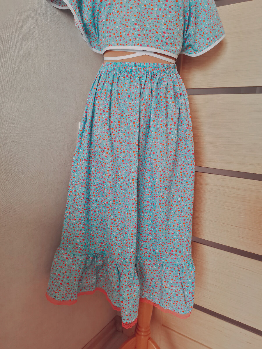 Юбку сшила за 2 часа (включая фотографирование, съемку и сопутствующие дела). Вдохновилась я тут стилем cottagecore. Ну, как "вдохновилась", когда-то я благодаря ему шить-то начала, только не знала, как он называется, "деревенским" звала 😅 В общем, насмотрелась видосов (даже НЕ ШВЕЙНЫХ), где милые девушки хлопочут по хозяйству, и все они такие ладненькие, женственные, теплые... 🤤 И не сдержалась! Смотрю: время - вечер, дома - никого, дай, думаю, пошью, а то ж ведь не усну! Сказано - сделано. Использовала давно пылившийся в шкафу отрез ивановского ситца. 80 см шириной. Расцветка - класс! Очень веселит, вдохновляет и дает прилив сил и эмоций! 😍 1 ярус: 80 см (ширина) х 64 см (высота яруса) - 2 шт. 2 ярус: 80 см х 17 см - 3 шт. Кромка на ситце мягкая и не стягивающая, поэтому вопрос о том, оставлять ее или нет, даже не вставал. Я шила прямо с кромкой, благодаря чему не пришлось обрабатывать некоторые швы. Пояс уже учтен в длине верхнего яруса. Так проще, меньше заморочек и швов 😂 Сде