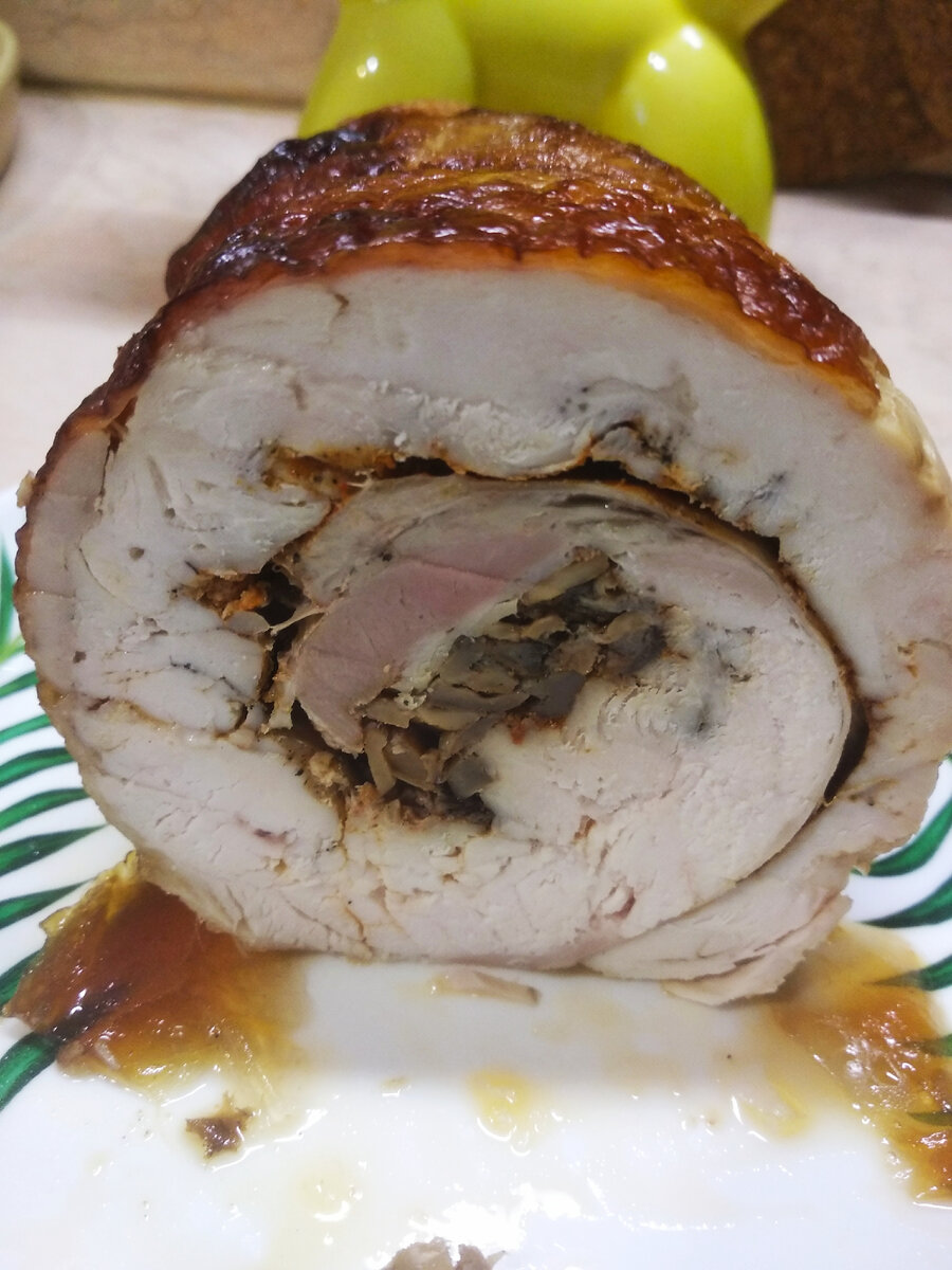 Ароматные бутерброды на завтрак, холодная закуска на обед, пикантное горячее на ужин. Так же обалденно смотрится на праздничном столе. В этот раз для начинки я использовала обжаренные грибы с луком, чуть чеснока и копченую паприку. Начинки могут быть разными на ваше усмотрение, но об этом в конце)) Курица – тушка (у меня 1,7 кг.) Грибы – 250 гр. Лук – 1 шт. Чеснок – 3 зубчика Желатин (пакетик 10 гр.) или агар–агар – чуть-чуть (≈5 гр.) Соль, перец, паприка (у меня копчёная) Соевый соус (для глазури) – 0,5 ст.л Мед (для глазури) – 1/4 ч.л. Масло растительное 1. Для начинки обжарить на большом огне мелко порезанные грибы и мелко порезанный лук. Посолить и поперчить. Оставить в сторонку охлаждаться. 2. Курицу помыть, отрезать две крайние фаланги крыльев. Положить на спинку и разрезать по грудке и аккуратно отделить мясо от костей. Расплостать тушку. Разрезать грудки вдоль и развернуть как книжку, заполняя пустоты. Нам понадобится ровный пласт куриного мяса на коже. 3. Нак
