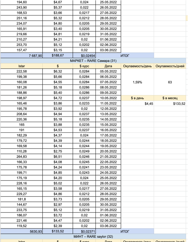 Месяц назад решили запустить полный круг минта (6 приглашений) и посчитать по факту что у нас получится, вот ссылка на таблицу: https://docs.google.com/spreadsheets/d/1FRWPPgfOThLLymM08GjGKjKyT70DXURGy8BaFmQLTpI/edit?usp=sharing Там две вкладки: У нас растянулось это более чем на 20 дней, и за это время разработчики успели изменить логику по стоимости приглашений, поэтому то, что вы увидите в таблице по окупаемостям, стоимостям и тому подобное, это просто исторические данные, и по факту повторения опыта вы можете не достичь таких цифр как у нас. Не финансовые советы! DYOR Куда смотреть и что видеть? Первое это сколько персонажи принесли $ пока изучали английский, выглядит это следующим образом: В верхней части мы наблюдаем расчеты инватов старика и самары Родители = старик и самара
