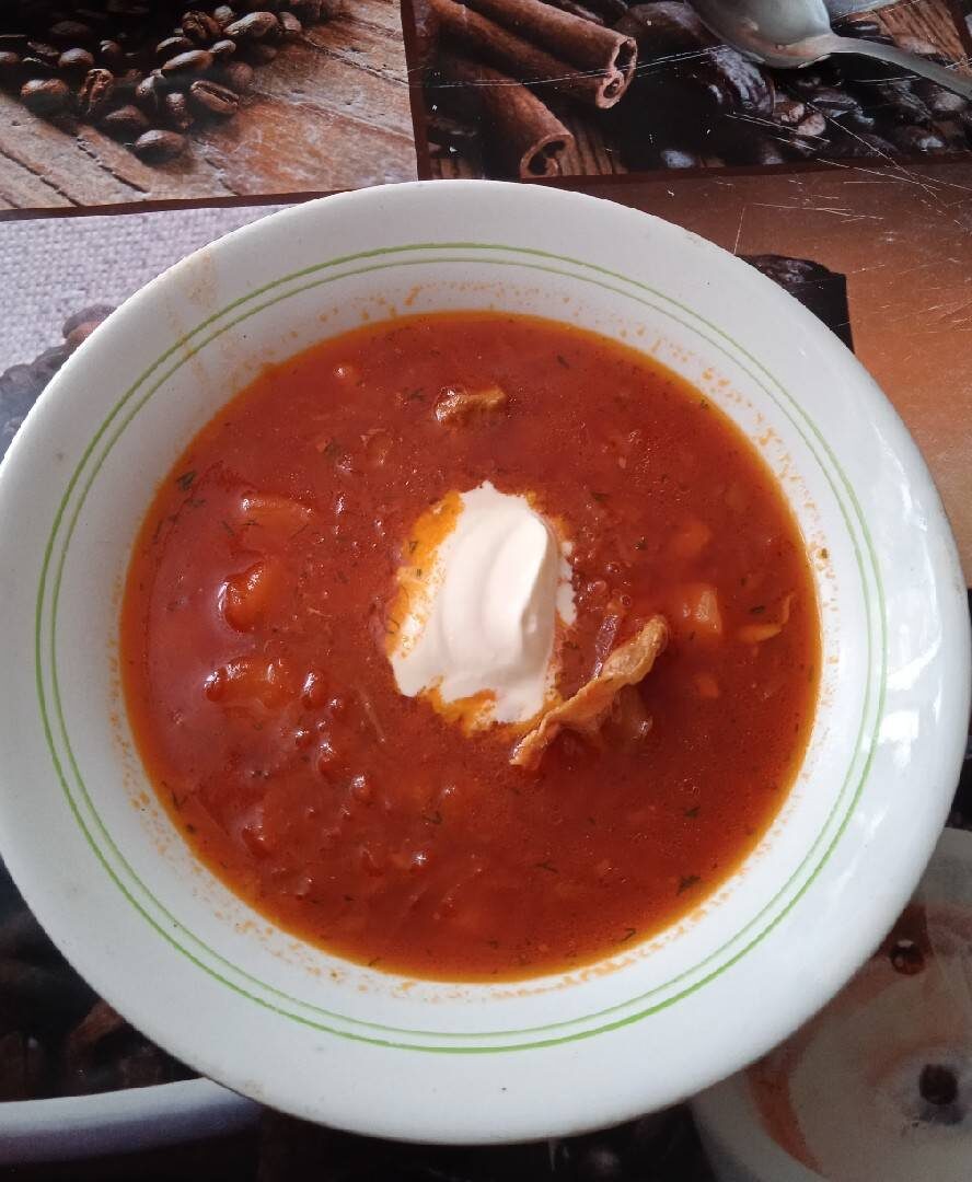 Ингредиенты: буряку, цибулина, моркви, води, капусти, баранячих реберець, картоплин, соняшникової олії, Лавровий лист, часнику, Кріп, Сіль, цукор , томатної пасти Способ приготовления: Підготувати інгредієнти. Моркву, буряк натерти на тертці. Цибулю порізати маленькими шматочками. Нарізати кубиками картоплю. Пошинкувати капусту Реберця залити водою та поставити варитися до готовності годинку. Зварені реберця витягнути. Вкинути картоплю і капусту варитися. Моркву, буряк та цибулю обжарити на сковорідці. Додати до картоплі і капусти. М'ясо порізати на шматочки та додати в каструлю. Варити до готовності. Додати кріп та часник. Вимкнути. Сіль та цукор додати по смаку.