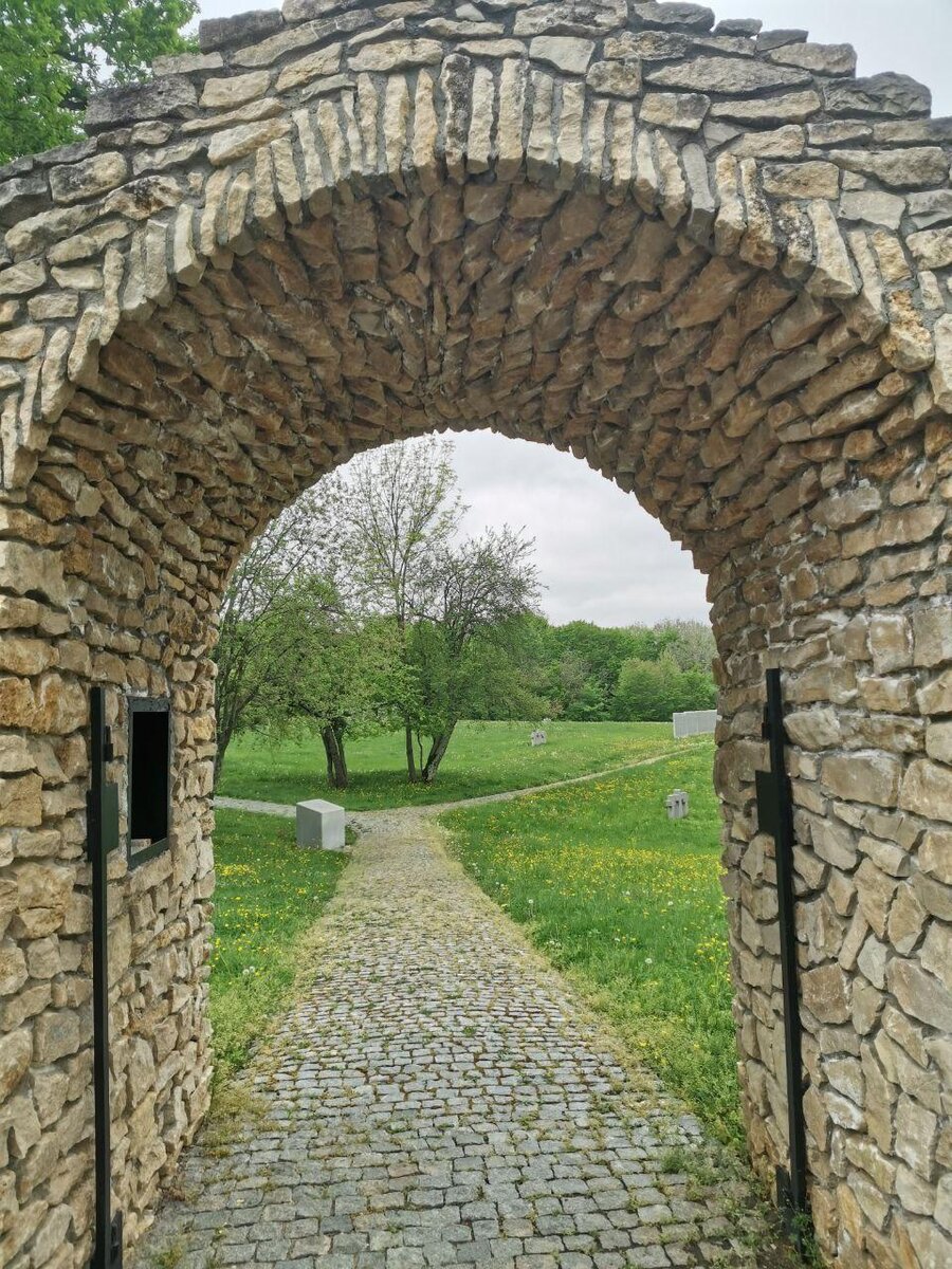 Сразу на входе установлена «скамья примирения», и у неё есть собственная история – когда немецкие деятели, кто строил этот мемориал, увидели два сросшихся дерева (груша вросла в дуб) они усмотрели в этом какой-то знак и не стали дерево пилить, а просто поставили около него скамью.