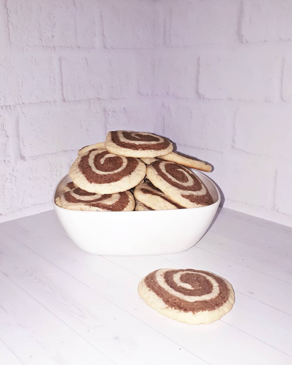 Муку перетереть с маслом (маргарином). Руками удобнее. Добавить сахар, яйца, разрыхлитель, ванилин, соль. Все перемешать. Тесто разделить на 2 части. В одну добавить 3 ст.л. муки, во вторую 2 ст.л. какао + 3 ст.л. муки. Каждую часть хорошо перемешать. Далее раскатываем тесто. Сначала белое, затем сверху кладем раскатанное коричневое. И скатываем рулет. Оборачиваем пищевой пленкой и убираем в холодильник на 30 минут. Затем достаем тесто и режем его на кусочки. Выпекать при t°180-200 градусов 15-20 минут. Вкуснятина!