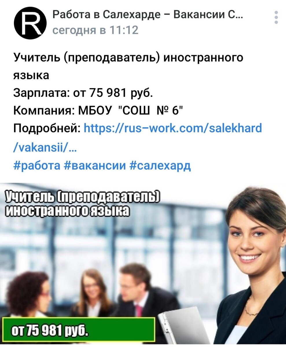 - Тебе повезло! У тебя хорошая работа и большая зарплата! - заявила мне на днях родственница, живет она в Поволжье в Ульяновске. А я "богачка" на Ямале. Лет 10 назад она же меня спросила : - Тысяч двести- то, наверное, получаешь!!!! (это когда у меня зарплата тысяч 55 была). Люди любят считать чужие деньги. И по их мнению - деньги эти несправедливо сами собой сыпятся на наши на банковские карточки. А нулями в цифрах на счетах можно вместо обоев стены клеить. Реальность же доходов простых людей ( не чиновников, не руководителей высшего звена или сотрудников Газпрома) многих разочарует. Вот подборка вакансий на май - июнь из реально существующей группы в ВК "Работа в Салехарде" УЧИТЕЛЬ ИНОСТРАННОГО ЯЗЫКА 1.Пятидневная рабочая неделя (с понедельника по включительно) с нормируемой продолжительностью рабочего времени: 27 часов в неделю в соответствии с расписанием учебных занятий. 2.Ежегодная премия 72134 руб. 3. Должностной оклад (ставка) 18 496,00 . Должностной оклад с учетом н