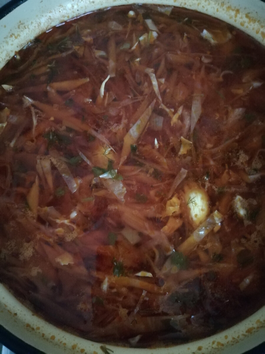 Сегодня суббота-на работу идти не надо и с утра я подумала: чем бы заняться?!🤔 Ну, конечно, приготовить дома что-нибудь вкусненькое и побольше! Задумала себе план и приступила к его выполнению. Первым пунктом было посещение магазина. Сходила, докупила недостающие продукты необходимые для моего поварского дела🥔🥬🍅 Только после этого я задумалась, что приготовление того, что я хочу, займёт ни много ни мало-целый день. Ну что известная пословица гласит: Глаза боятся, а руки-делают. 😊 Первым моим блюдом был: борщ. Красный борщ моя семья очень любит, ест его с большим удовольствием. Я сейчас не хвалюсь, но я действительно умею его готовить, это факт! Могу потягаться с поварами с большим опытом в его приготовлении. Ну так вот:на чем мы остановились🤔ах, да! Первым был борщ. Рецепт борща прост: Бульон, в него: картошка кубком🥔 зажарка: лук + морковь🥕, бурак+болгарский перчик, 🌶️томат🍅 ну или паста 🍅 Уксус, я добавляю в зажарку совсем немного, для цвета, вкуса и запаха. 👃 Шинк