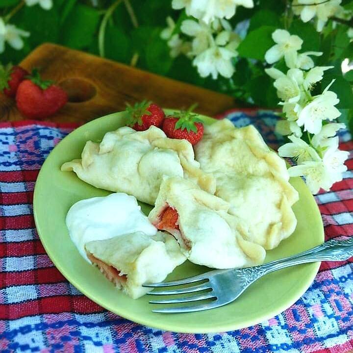 Как говорила моя бабушка: "Большому куску и рот радуется!". А размер этих вареников действительно большой. #непп #традиции #Ростовнадону Ингредиенты: Тесто, кефира, яйцо, сахара, соли, соды, муки, Начинка, клубники, сахар Способ приготовления: Кефир смешать с яйцом. Добавить сахар и соль, перемешать. Всыпать соду, перемешать. Подсыпая муку, вымесить тесто. Как только тесто перестало липнуть к рукам, муки достаточно. Накрыть и оставить на 20 минут. Клубнику хорошо промыть, удалить хвостики и просушить. Ягоды у меня некрупные, поэтому оставила целыми. Тесто разделить на 15 частей. Раскатать толщиной примерно 0.5 см. Заготовки не должны быть тонкими. В центр насыпать сахар (я кладу 1 ч л). Положить клубнику и хорошо защипнуть края. Вареники закинуть в кипящую, чуть подсоленную, воду. Накрыть крышкой, дать закипеть, убавить огонь и варить 2 минуты. Варить по 4-5 шт, вареники увеличиваются в размере. Вареники выкладывать шумовкой на плоское блюдо в один ряд. Можно полить растопленным сливоч