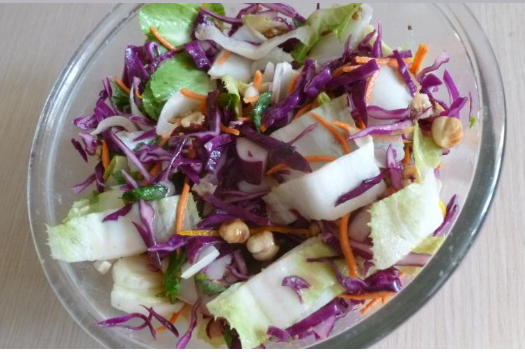 #меню Салат Коул слоу (cole slaw в переводе "шинкованная капуста") – традиционный американский салат из капусты, варианты его приготовления весьма разнообразны. Салат хорош для любого времени года, и зимой и летом он будет к месту. Главная фишка этого, казалось бы, простого капустного салата в заправке с добавлением горчицы и уксуса, именно она придает салату очень оригинальный и пикантный вкус. Ингредиенты: капуста краснокочанная, цикорий (салат), морковь, изюм, ореховая смесь (грецкие, арахис, кешью, фундук), апельсин (сок и цедра), лимона (сок и цедра), мята, горчица неострая, мед, оливковое (или ореховое) масло, соль, перец Способ приготовления: Смешать цедру и сок лимона и апельсина, полить изюм и оставить на 30 минут. Капусту нашинковать, чуть посолить и помять руками. Морковь тонко нарезать. Цикорий разобрать на листья и нарезать широко. Орехи обжарить на сухой сковороде и порубить. У мяты удалить веточки, мелко нарезать. Для заправки смешать мед, горчицу и сок от изюма. Добавит