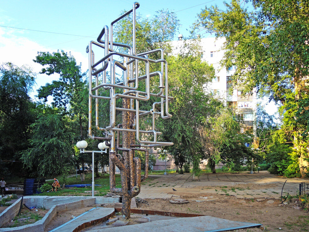 Продолжаю показывать арт-объекты, которые устанавливает в Самаре местное отделение Водоканала. Часть из них являются постоянными, часть - каждый год меняются. Что-то я уже показал. По ссылкам ниже можно посмотреть небольшую галерею арт-объектов. В очередной подборке покажу один из самых первых и один из самых неоднозначных (я бы даже сказал неудачных) экспериментов. Арт-объект фонтан «Древо жизни» был открыт в 2017 году в сквере на пересечении улиц Полевой и Галактионовской. Событие было приурочено к 130-летию начала работы первого самарского водопровода. Дата эта исполнилась, правда, в 2016 году. Видимо, тогда возникла сама идея. Авторы проекта - самарские скульпторы Кристина Цибер и Николай Куклев. Композиция представляет собой переплетение водопроводных труб в форме условно дерева. Часть этих труб течёт, что и выводит арт-объект в статус фонтана. Я считаю, отличная реклама фирме. Кроме того, судя по всему, изначальный проект был ещё и изменён. Вроде бы чаша фонтана должна была быть,