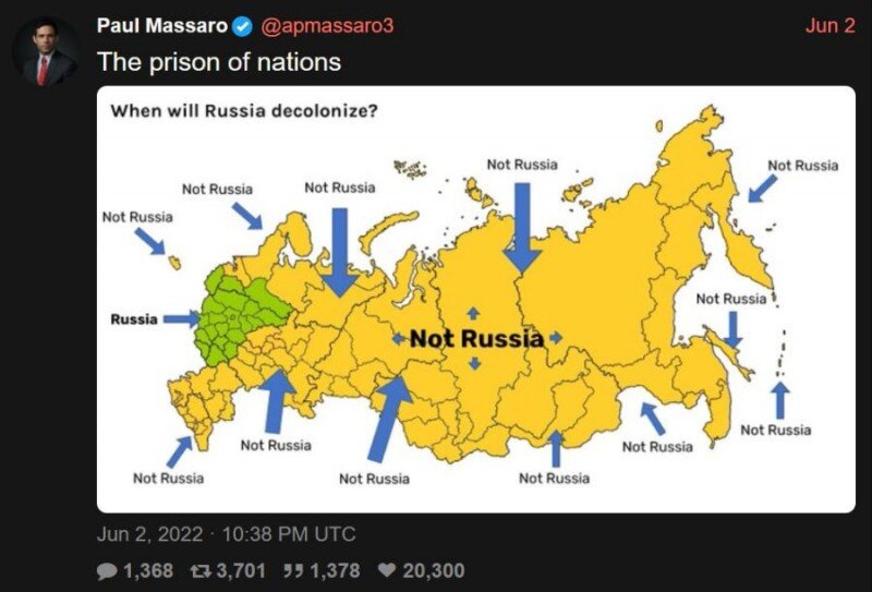 Из новостей: американский конгрессмен Пол Массаро в своём твите предложил урезать Россию. Отметив на карте то, что, по его мнению, Россией не является. Фактически Россией он готов, скрепя сердце, признать только территорию средневекового Московского княжества.