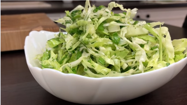 Ингредиенты: Мелко шинкуем капусту, можно использовать не только молодую капусту, но и обычную. Если она твердовата, то присыпьте ее солью и помните руками, чтобы она дала сок. Тогда капуста станет мягче. Мелко нарезаем укроп и зеленый лук . Подготовим заправку . На 4-5 столовых ложек растительного масла добавляем одну столовую ложку лимонного сока, чайную ложку сахара без горки, 1/2 чайной ложки соли и 1/4 чайной ложки молотого перца. Все перемешиваем и заправляем салат. Такая заправка придает салату весенний аромат. 🔥 Лучшее в телеграм: Посмотреть Если этот салат оставить под пищевой пленкой примерно часа на 3 — 4, то капуста немного подмаринуется, станет еще более мягкой и вкусной. Так же плюс этого салата в том, что его можно готовить на два дня, он не только не испортится, а еще больше настоится.