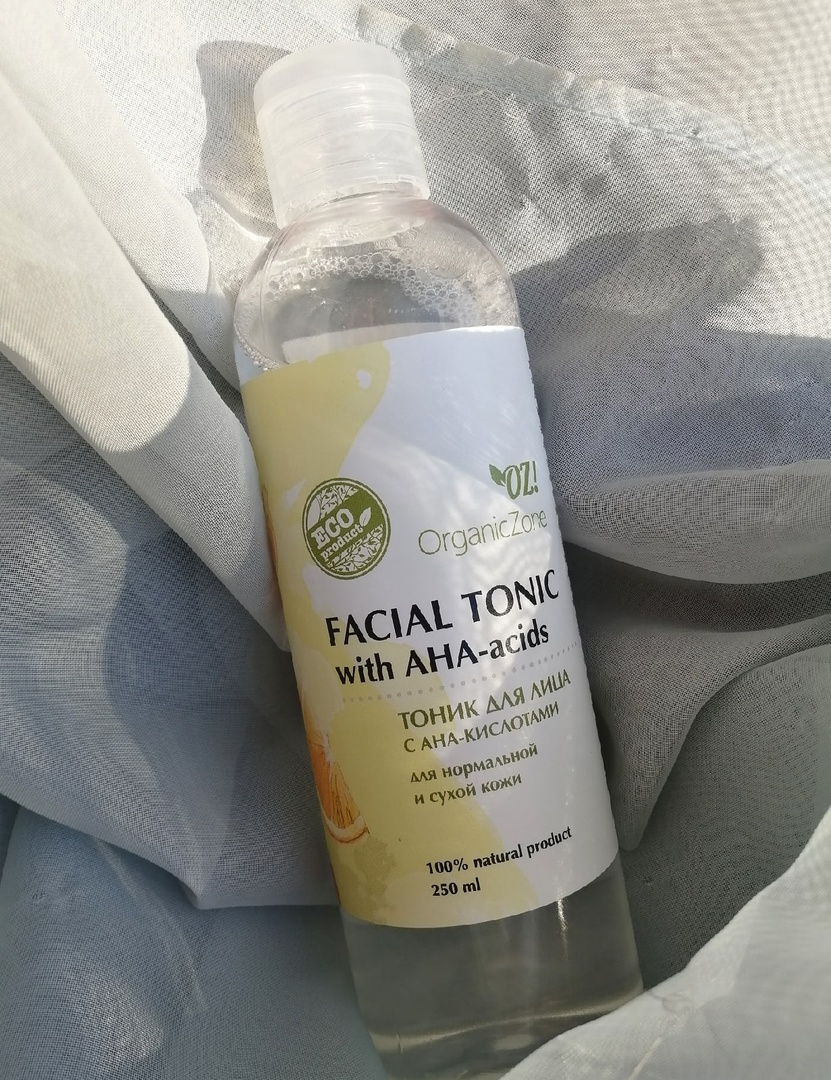 «Тоник для нормальной и сухой кожи с АНА-кислотами укрепляет и омолаживает кожу, отшелушивает ороговевший слой и ускоряет обновление клеток. Витамин Е, витамин F стимулируют выработку эластина и коллагена. Экстракты красного апельсина, помело, хассаку выравнивают цвет лица, убирают воспаления и шелушения», — заявляет нам производитель.