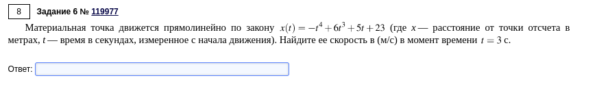 Решается данная задача на самом деле элементарно. Достаточно лишь знать одно из правил кинематики, что если взять производную у зависимости S(t) (в нашем случае это x(t)), то мы с вами получим новую зависимость скорости от времени v(t). Значит, наша задача - найти производную данной функции и найти значение производной в точке t = 3. Приступим к выполнению задания!