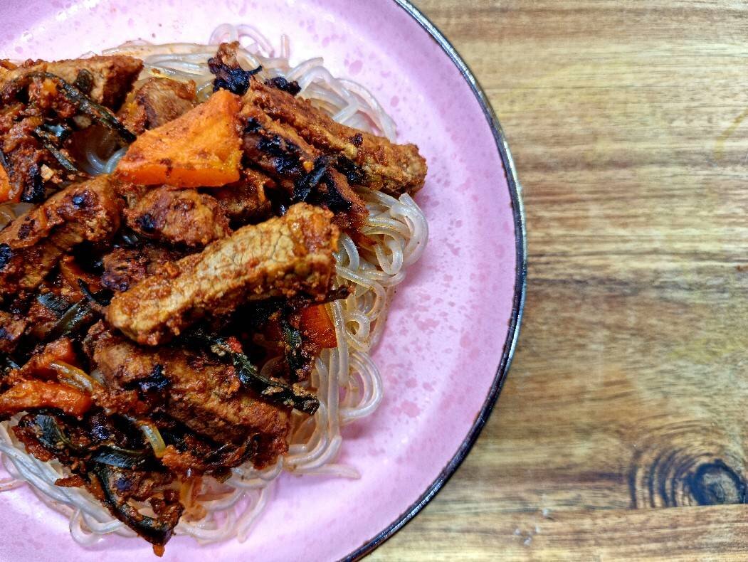 Специфический вкус этого блюда делает традиционная для Китая приправа Маласянь. И немного соевый соус с морской капустой. Ингредиенты: вырезки говядины, моркови, томатной пасты, соевого соуса, морской капусты сухой комбу, чеснока, растительного масла, приправы маласянь, воды Способ приготовления: Говядину нарезать полосками, припустить на разогретом масле. Добавить чеснок и морковь тёртую и порезанную, влить воду и соевый соус. Довести до кипения на среднем огне, добавить комбу и убавить огонь до минимума. Ввести томатную пасту и добавить приправу. Тушить на малом огне около 40 минут, до мягкости говядины, подать с фунчозой, отваренной в кипящей воде 6 минут.