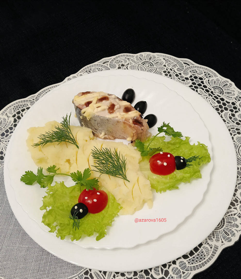 Затем достать форму, убрать верхнюю фольгу и отправить форму обратно ещё на 5 минут. Достать рыбу и подавать с пюре. К этой рыбе подходит соус терияки. Можно украсить блюдо божьими коровками из помидорок черри и маслин на листиках салата.
