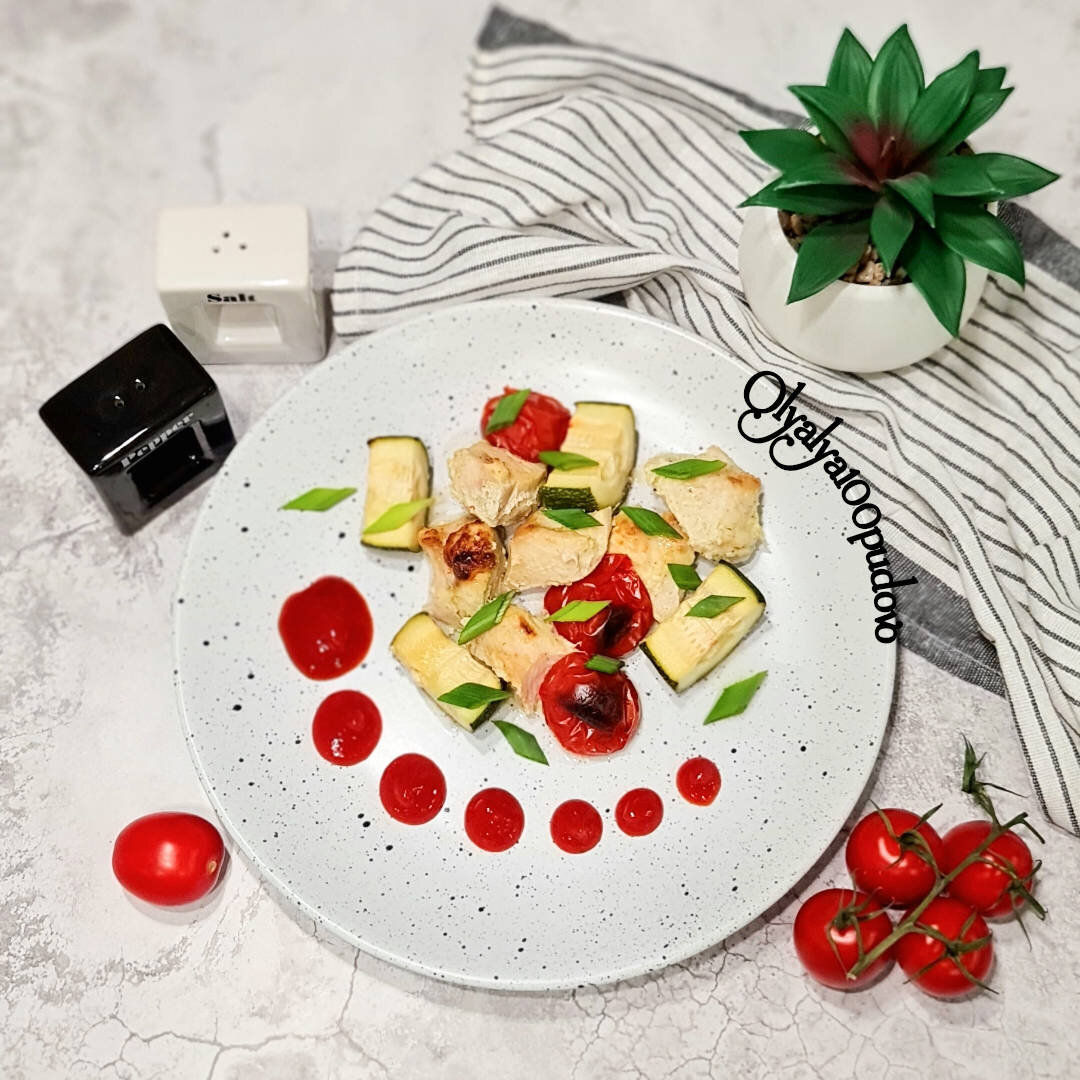 Ингредиенты: Для маринования куриной грудки:, куриной грудки, соли, хмели-сунели, чеснока, растительного масла, майонеза или сметаны, Дополнительно:, цукини, помидоров черри, соли, Для украшения:, зелень лука, кетчуп