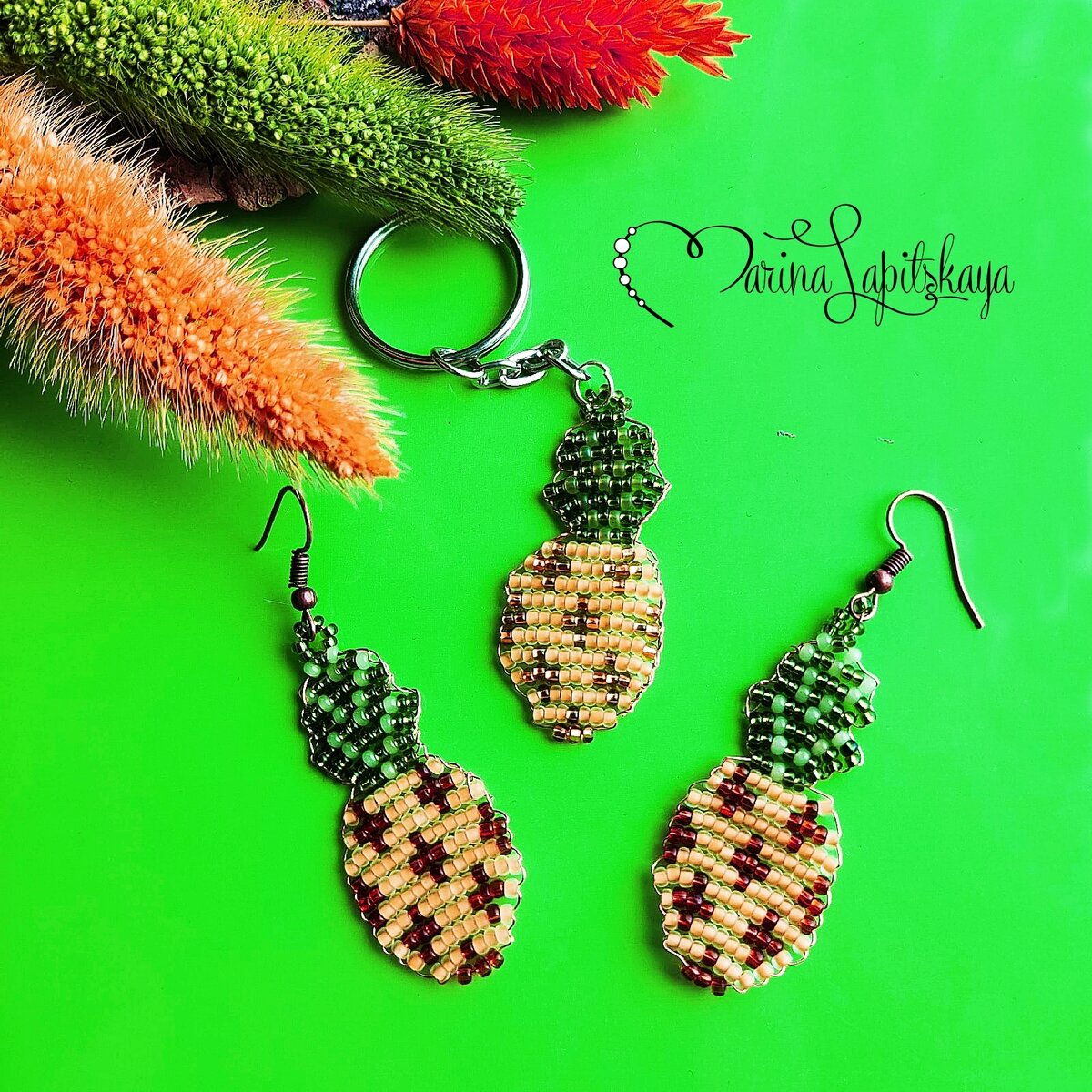 Фрукт зовётся… АНАНАС. Для изготовления ананасика используется техника параллельного плетения. Более подробно она описана в моей статье "Мастер-класс "Арбузик" Чтобы изготовить серьги потребуется: 🍍 отрезок проволоки толщиной 0,25-0,3 мм длиной 70 см, 🍍 бисер №10 (желтый, коричневый, светло-зеленый, темно-зеленый), 🍍 швензы для сережек, основа для подвески или брелочка. Схема плетения Спасибо за внимание!
