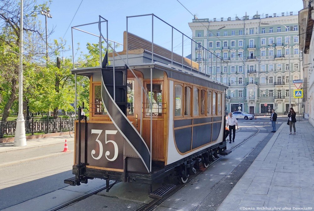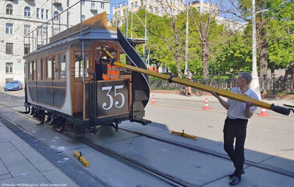 Давненько в Москве не было трамвайных парадов. А конкретнее - с 13 июля 2019 года. Потом наступила пандемия, и вот это всё, с масками и перчатками в общественном транспорте (в электричках Ярославского направления, кстати, звуковая информация до сих пор требует их использовать). Но, тем не менее, времена проходят и уходят - и 4 июня 2022 года в Москве прошло очередное такое вот мероприятие. Вагон конки, традиционно, привезли к Чистым прудам на буксире: Лошадей, правда, подвезли позже, их я не застал: А это сам буксир, притащивший вагон конки, на фоне известного московского "Дома со зверями": Поскольку снимать всё остальное действие на Чистых прудах смысла не было - там собралось бы сто пятьсот тысяч миллионов народу - я дошёл до любимого Большого Устьинского моста. Народа и тут было уже предостаточно, хотя я и пришёл за час до старта парада. Но местечко нашлось. И вот - наступил час Икс: Понятно, что нового ничего не было, да и старая, виденная уже не раз в прошлом трамвайная техника п
