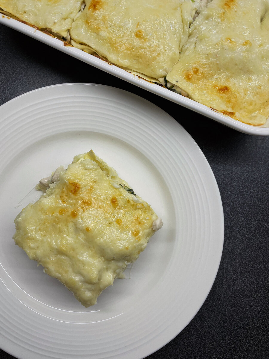 Ингредиенты: • лук репчатый 1-2 шт • курагрудь ~700 г • шпинат пучок • пармезан • листы пасты 12 шт • масло оливковое • соль • перец Для соуса Бешамель: • молоко 500 мл • мука 5 ст л • масло сливочное 50 г • соль • мускатный орех Процесс: Разогреваем оливковое масло на сковороде, обжариваем рубленый лук, добавляем рубленую курагрудь, обжариваем. Солим, перчим, кладём шпинат, готовим до готовности)) Тем временем сварим Бешамель. В сотейнике топим сливочное масло, потихоньку всыпаем муку, консистируем, вливаем молоко (у меня комнатной температуры), солим, всыпаем мускатный орех, готовим пока не загустеет (на небольшом огне). Следите за комочками - их быть не должно☝🏼😁 Берём блюдо для запекания. В прошлый раз смазывали сливочным маслом, в этот раз предлагаю сразу соусом) Размазываем соус по блюду, кладём листы пасты, снова соус, далее выкладываем начинку, снова листы пасты и тд, повторяем 4 раза, где последний паста и Бешамель. В конце посыпаем тёртым пармезаном и накрыв