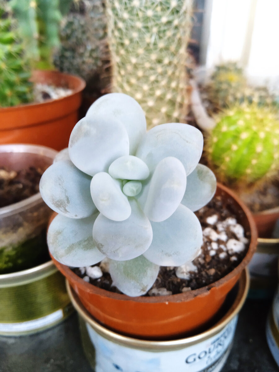 Всем привет! Всем очень рада! Пахифитум Овиферум, он же Яйценосный, он же лунный камень, правда интересные названия, даже немного романтичные. Но пахифитум и сам по себе очень интересный и немного романтичный суккулент, но в отличии от других красавчиков суккулентов, он очень легко выращивается на балконе квартиры. И не требовательное в уходе растение. Пахифитум растет очень медленно , при чем рост его идёт и в длину и в ширину. Имеет очень компактную розетку с округлыми пухлыми листьями, от сине- серого до розового оттенка. Лист пахифитума имеет восковой налёт, который очень легко повреждается из за чего суккулент теряет свою декоративность . Пахифитуму нужно очень хорошее освещение,легко переносит как прямые солнечные лучи так и рассеянный свет, но без хорошего освещения пахифитум теряет свою компактность и начинает тянуться вверх к свету из за чего появляется длинный ствол с большими промежутками между листьями. Пахифитум для меня как универсальный солдат, и в жару( а у меня лето