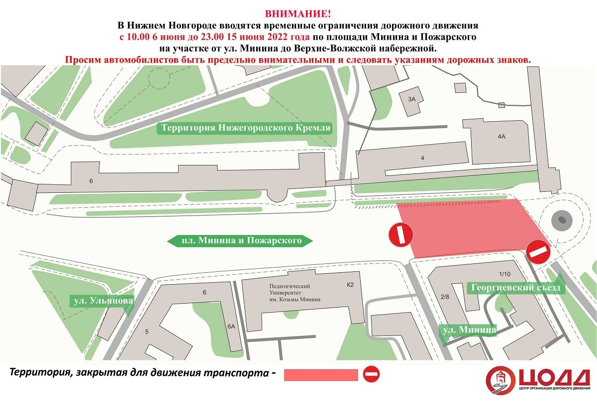 Движение транспорта на площади Минина и Пожарского ограничат с 6 июня