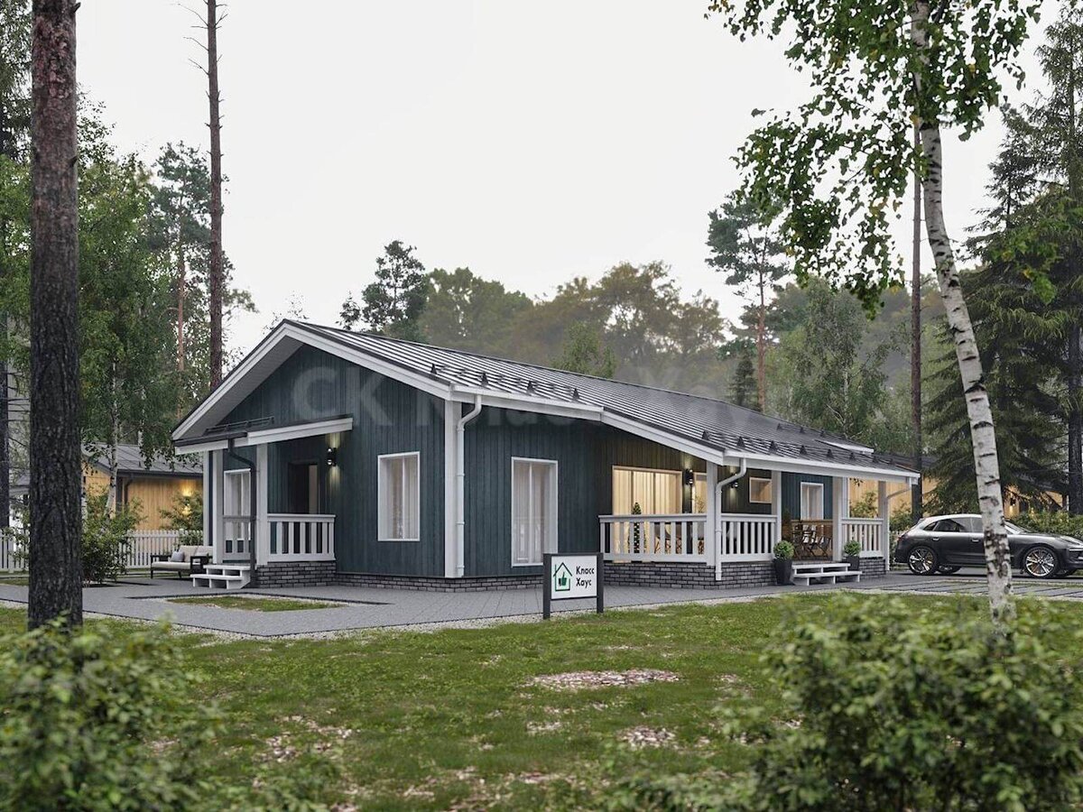 Одноэтажный каркасный дом 131кв. м, габариты 9×14,6 м. Четыре спальни, санузел, входная зона, просторная кухня-гостиная и две террасы. Дом оборудован отдельными техническими помещениями - котельной, кладовой и постирочной.