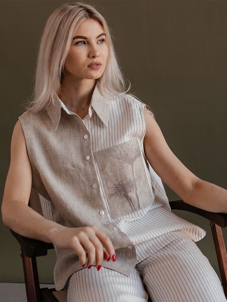 Блузки из льна изготавливаются из 100%-й льняной ткани, они совершенно не магнитятся, в них у вас не будет никогда проявлений аллергии. Привычный отложной воротник, комбинирование однотонной ткани на одной полочке и полосатой придает ей особый шарм.