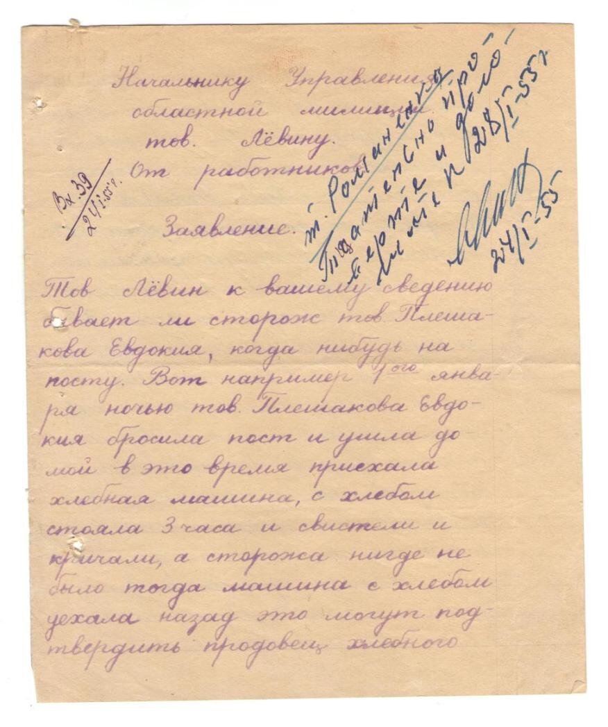 Анонимное Заявление "От работников" на имя Начальника Управления областной милиции тов. Лёвина, с резолюцией т. Лёвина: "Тчательно проверте и доложите". Заявление написано чернилами на листе (развороте) ученической тетради. Авторами являются работники предприятия где работает сторожем Евдокия Плешакова, о проступках которой идет речь в Заявлении. "Авторы" решили не указывать свои имена. Из содержания Заявления понятно, что его написала женщина, которая неравнодушна к безответственности и легкомысленности Евдокии Плешаковой. Сегодня этот документ вызывает ностальгическое чувство умиления от советских людей - как они жили, о чем были их заботы и как они были счастливы в своем 1955 году. Данное Заявление было изъято при уничтожении милицейского архива и сохранено для потомков. Примечательно, что несмотря на то, что Заявление анонимное и не имеет никакого отношения к милиции, а тем более к Начальнику Управления областной милиции тов. Лёвину, оно (Заявление) имеет входящий номер (№39 от 24.