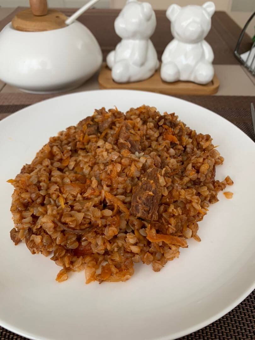 Ингредиенты: гречки, морковь, луковица, тушенка говяжья (любая другая), соль, специи , масло сливочное, вода, томатная паста