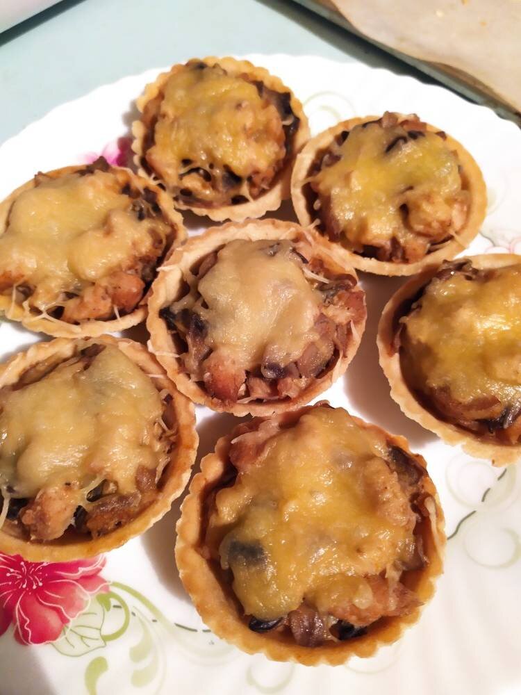 Ингредиенты: Тарталетки, Филе куриное, Грибы шампиньоны, Сметана, Чеснок, Приправа для курицы/мяса, Мука, Сыр