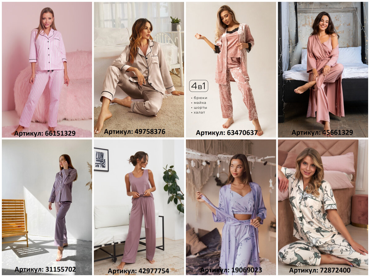 1. Артикул: 66151329 (ссылка). Пижама женская незаменимая вещь в гардеробе модницы. Вы будете комфортно себя чувствовать в любой обстановке. Только вам решать как использовать комплект. В качестве любимой пижамы, как одежду для дома или для дачи.