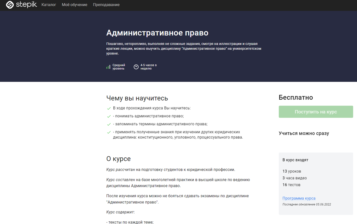 Административное право(онлайн-курс на Stepik) Пошагово, неторопливо, выполняя не сложные задания, смотря на иллюстрации и слушая краткие лекции, можно выучить дисциплину "Административное право" на университетском уровне. Чему вы научитесь В ходе прохождения курса Вы научитесь: - понимать административное право; - запоминать термины административного права; - применять полученные знания при изучении других юридических дисциплина: конституционного, уголовного, процессуального права. О курсе Курс рассчитанна подготовку студентов к юридической профессии. Курс составленна базе многолетней практики в высшей школе по ведению дисциплины Административное право. После изучения курса можно не бояться сдавать экзамены по дисциплине "Административное право". Курс содержит: - тексты по каждой теме; - опорные сигналы для запоминания по каждой теме; - озвученные тексты по каждой теме; - видео-лекции по каждой теме; - тесты для контроля усвоения материала. Для прохождения курса необходимо будет по-ша