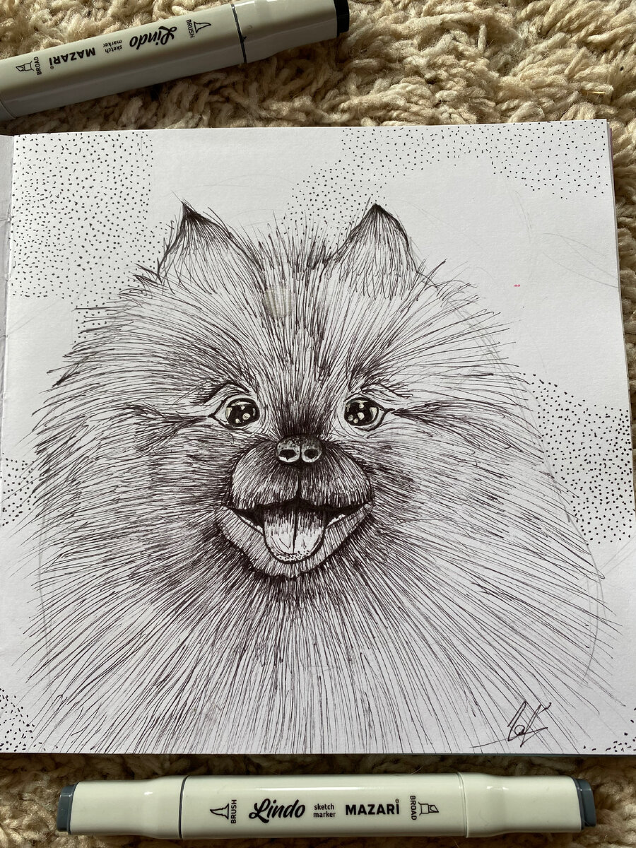 Всем привет! Я хотела бы провести опрос: У вас есть домашние животные? Пишите в комментариях. У меня есть померанский шпиц и я его нарисовала) Кстати рисунок я рисовала чёрной ручкой. Может быть скоро на моем канале появится видео урок как нарисовать такого шпица)