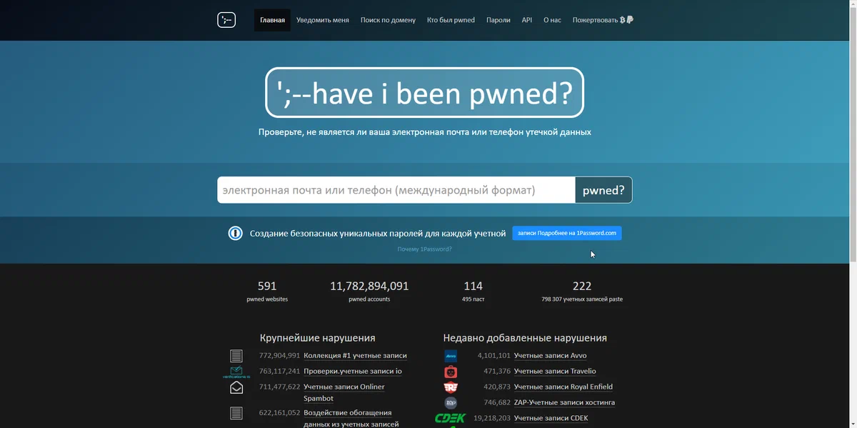 В современном мире, базы данных являются товаром. Их покупателями являются как маркетологи, банки, так и мошенники. Поэтому очень важно знать, являются ли ваши личные данные скомпрометированными. Данный сервис поможет вам. haveibeenpwned — сервис, позволяющий проверить, есть ли ваши данные в слитых базах. Поиск производится по e-mail адресу или номеру мобильного телефона.