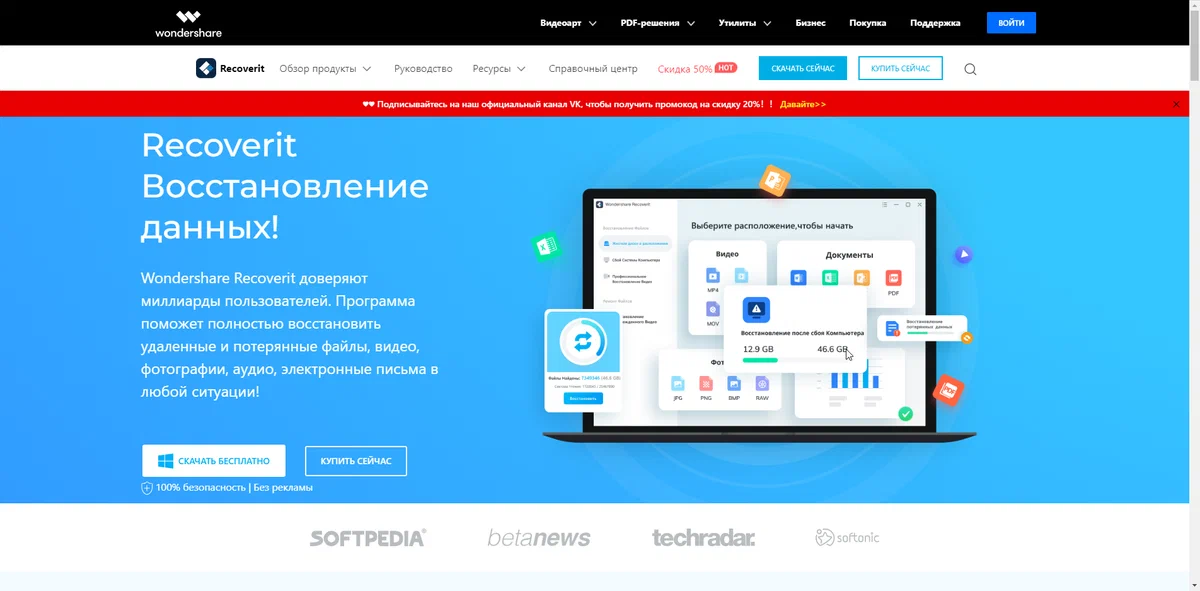 Wondershare Recoverit-при помощи данной утилиты вы сможете восстановить удалённые файлы на карте памяти из смартфона, планшета, фотокамеры, видеокамеры и жёсткого диска.