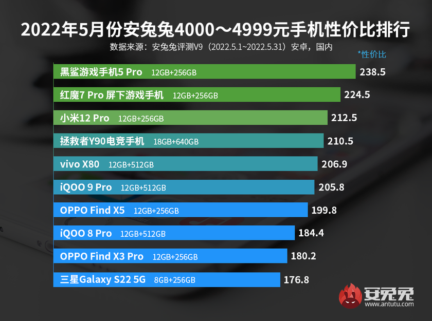 В сегменте $600-$750 лидирует Black Shark 5 Pro. На втором месте оказался nubia Red Magic 7 Pro, а на третьем – Xiaomi 12 Pro. В десятке также есть Lenovo Legion Y90, vivo X80, iQOO 9 Pro, OPPO Find X5, iQOO 8, OPPO Find X3 Pro иSamsung Galaxy S22 на Snapdragon 8 Gen1.