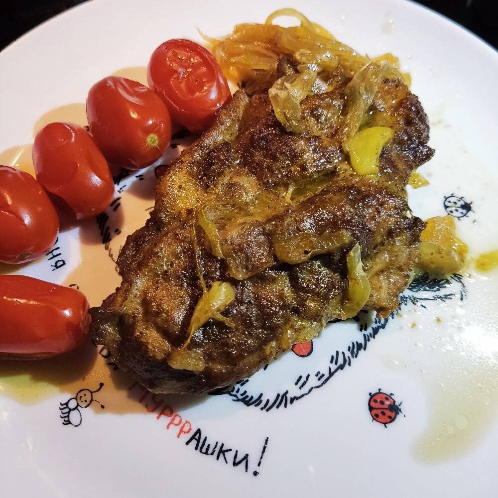 #свинина #духовка #мясо Ингредиенты: свиного ошейка, репчатого лука, чеснока, соль/специи, подсолнечного масла, сливочного масла, соевый соус, яблочный уксус, воды Способ приготовления: Свинину режем на стейки, толщиной 2 см. Смазываем мясо подсолнечным маслом, щедро обваливаем в специях и соли, нашпиговываем дольками чеснока, оставляем мариноваться на 1 час. Репчатый лук режем полукольцами и выкладываем на глубокий противень, сверху выкладываем промаринованное мясо. Заливаем мясо соусом (вода + винный уксус + соевый соус) и выкладываем кусочки сливочного масла. Плотно закрываем фольгой и ставим в разогретую до 180° духовку на 1 ч. 30 мин. Через указанное время снимаем фольгу, поливаем мясо собственным соком и убираем еще на 15 мин, до румяной корочки. Готово! Приятного аппетита :).